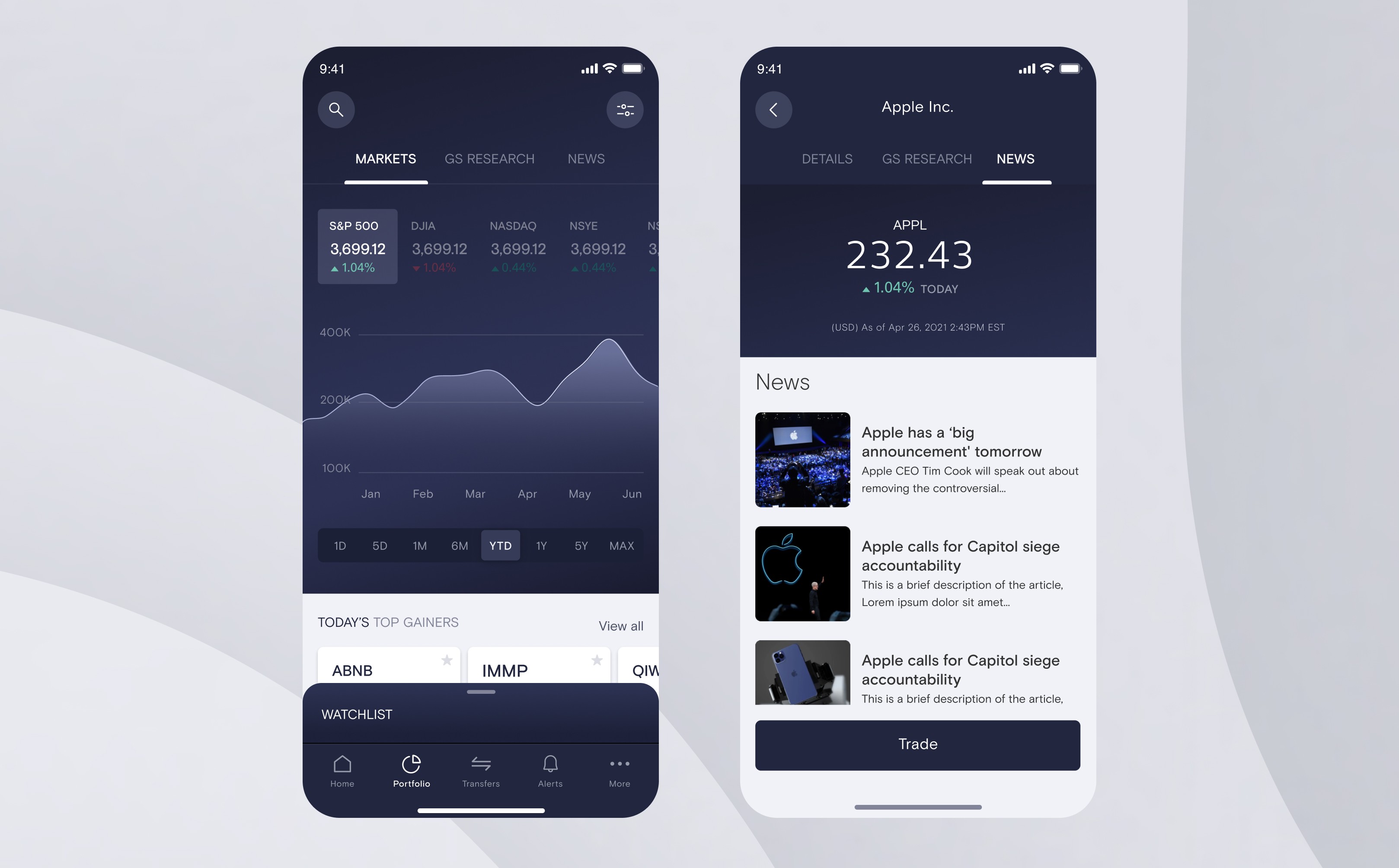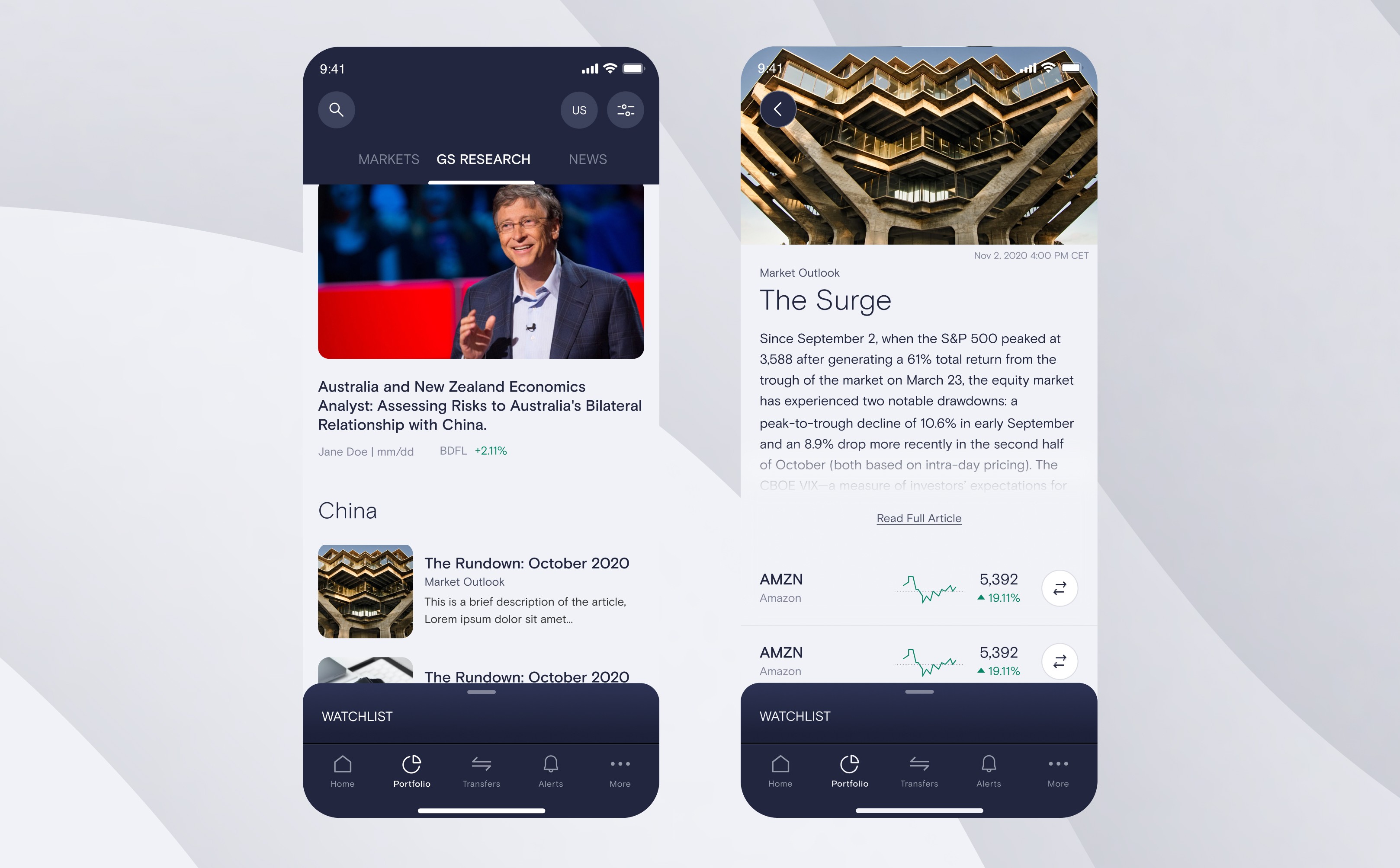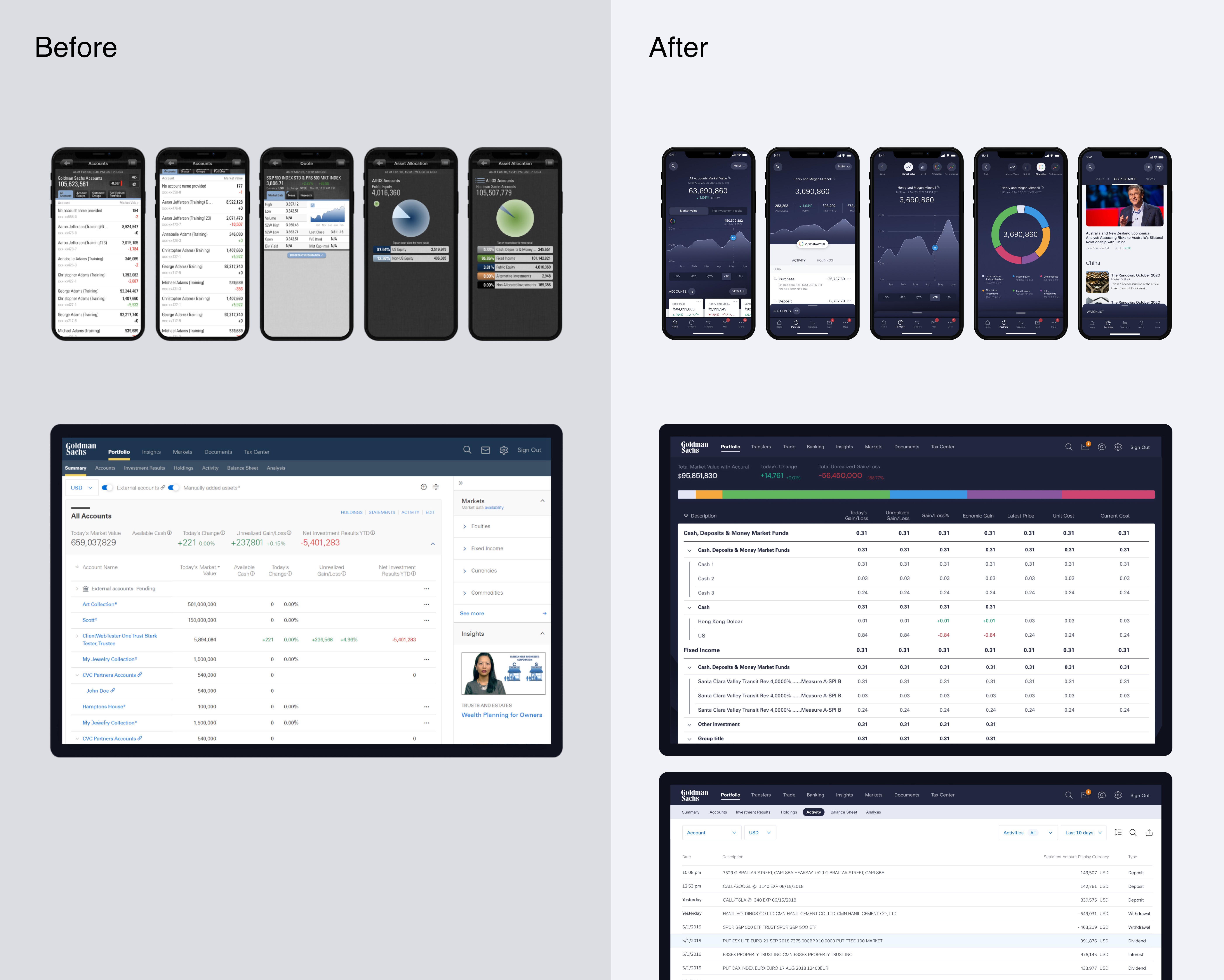 The Goldman Sachs Private Wealth Management mobile app harmoniously brings together an uplifted Visual Identity and Design System. Designed for the on-the-go ultra high net worth clientele, it provides a connected experience of investment banking, trading, news, insights, advisor communication, and much more. Since launch, it has improved digital advisor/client engagement by 44%, reduced support calls by 19%, improved the brands overall NPS score, and continues to save hundreds of hours of advisors time through self-serve and client collaboration tools.