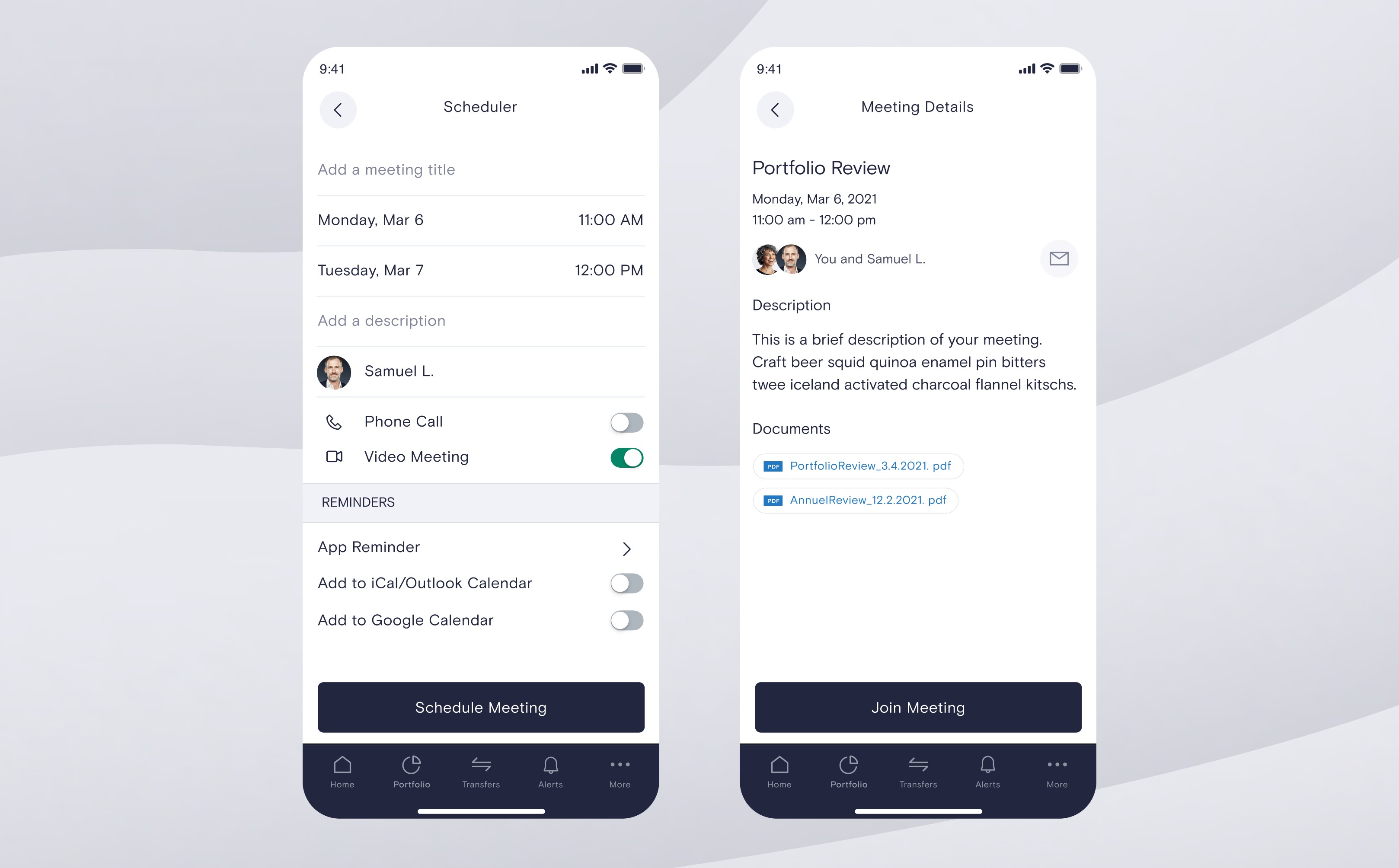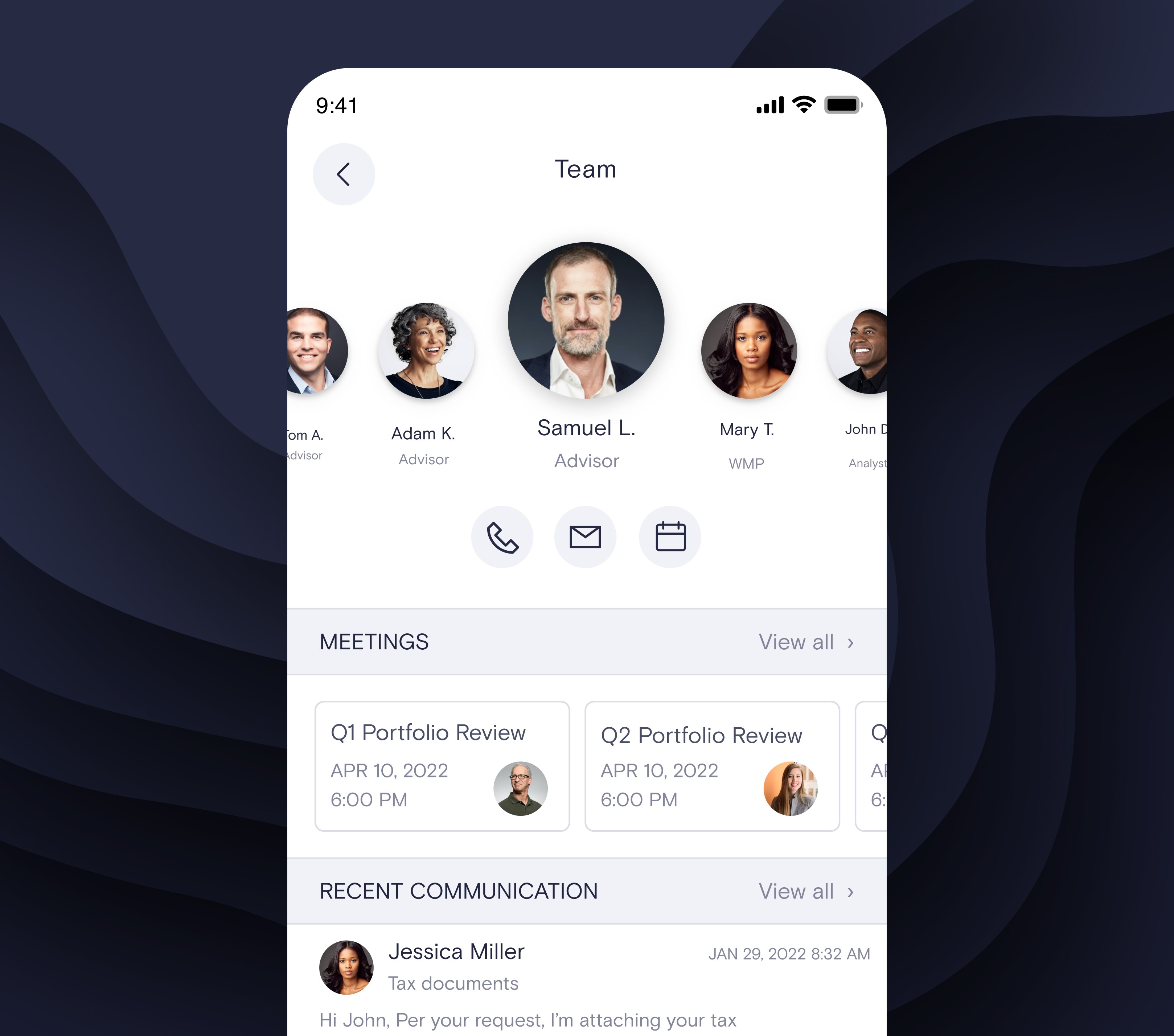 Your advisor team within the mobile app lets you request video meetings, preview meeting agendas, attach documents, and request changes. Recieve push notifications and reminders from the system and add all of these to your favorite calendar applications. Manage and personalize your profile by setting interest preferences, add/edit/delete contact information, update profile photos, signatures, signatories, and more.