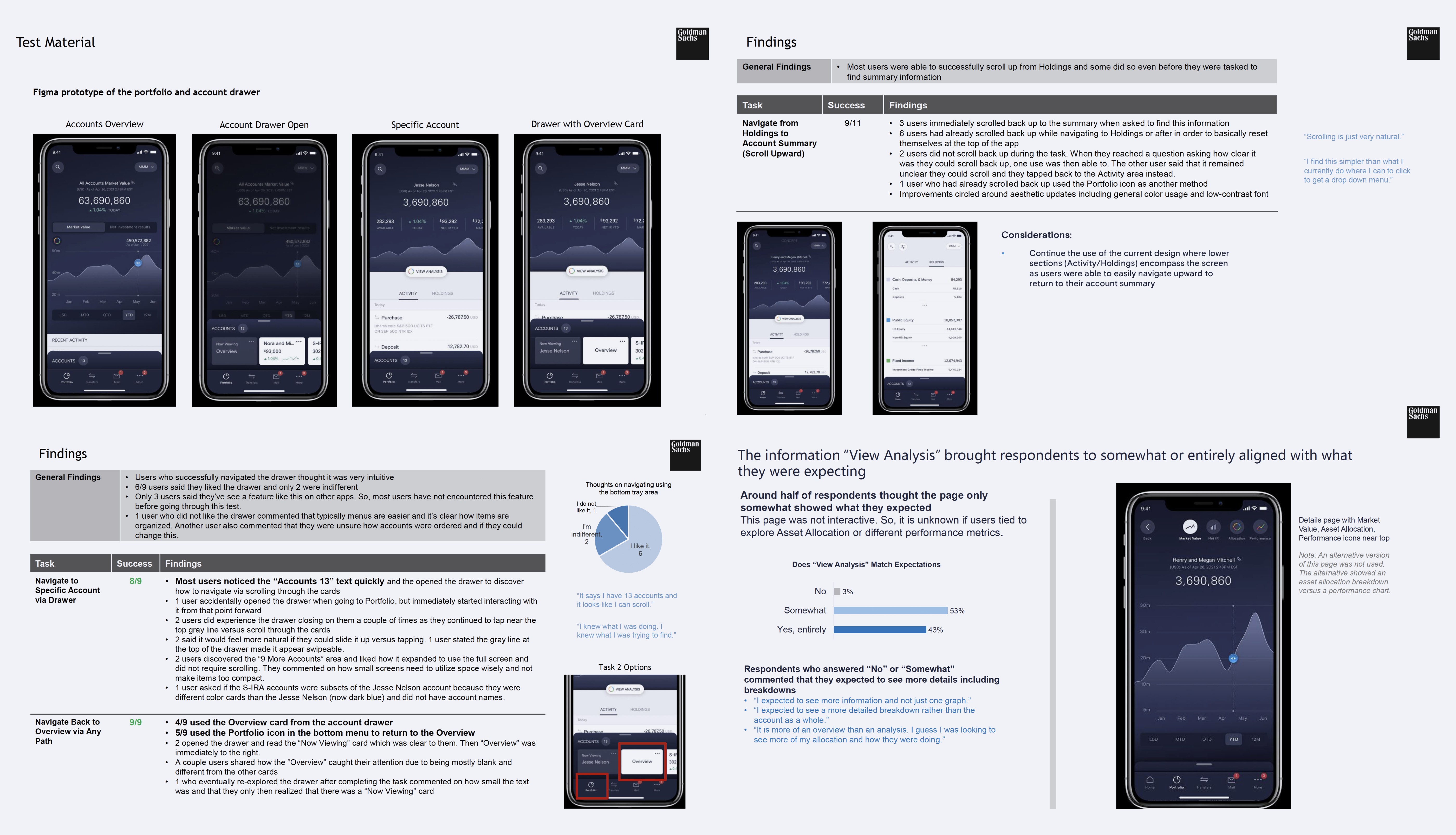 Foundational and evaluative research for the Goldman Sachs Private Wealth Management mobile app was focused on understanding the needs of ultra–high-net-worth clients/advisors and assessing the effectiveness, usability, and desirability of the redesigned mobile experience. Through stakeholder workshops, client interviews, advisor shadowing, and platform analytics, we evaluated how well the new experience addressed long-standing usability and workflow challenges.