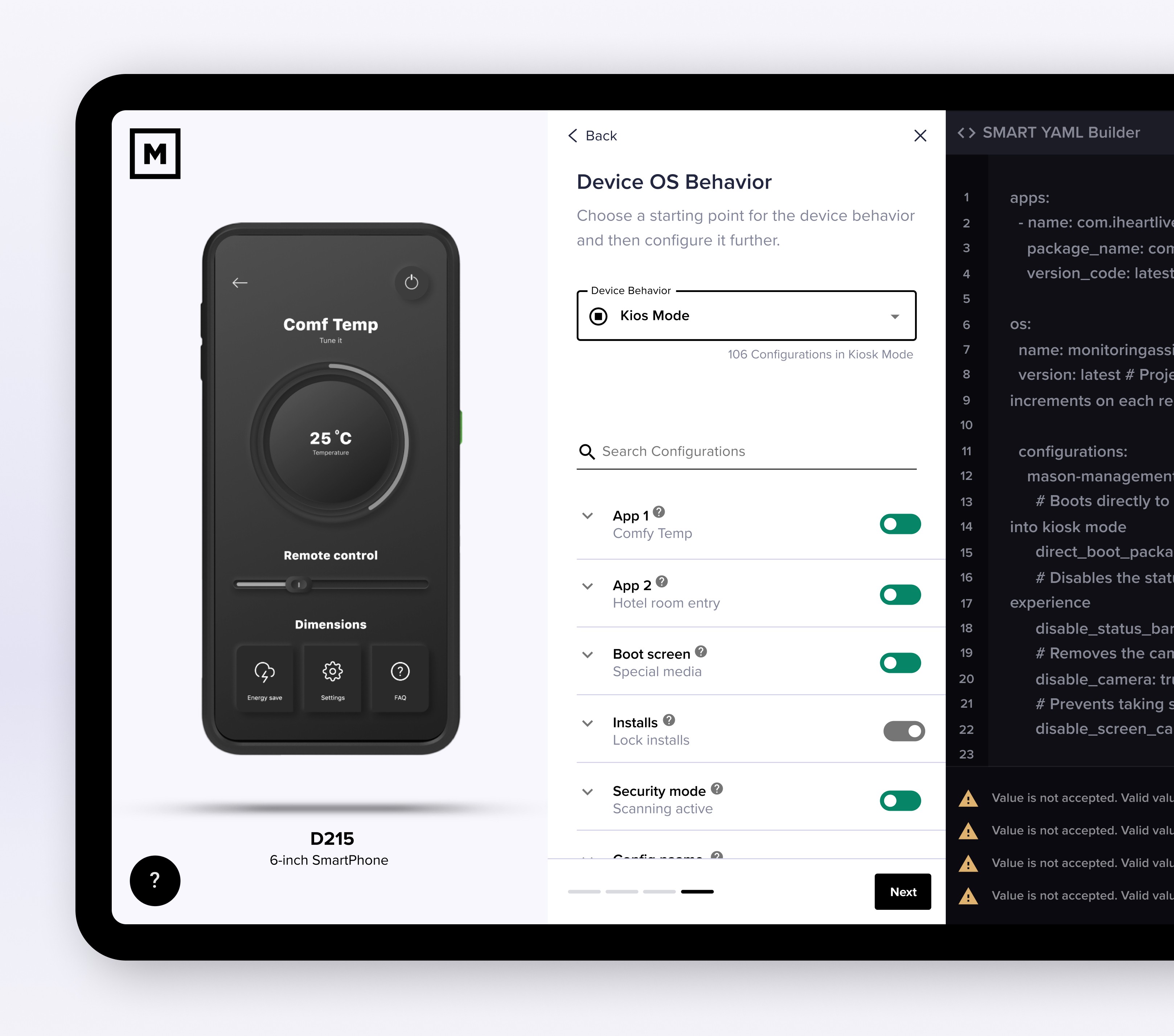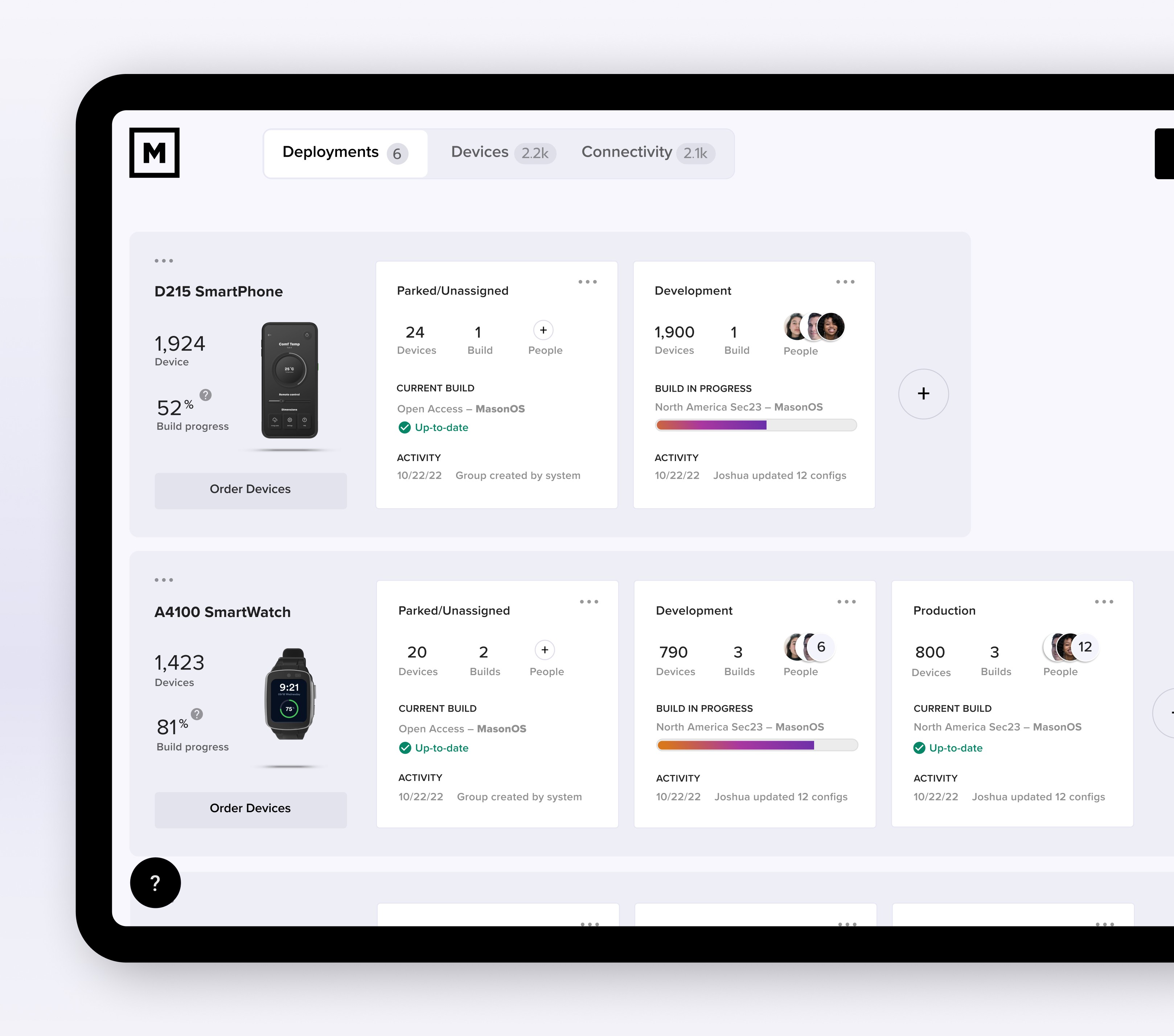 Mason provides mobile infrastructure and hardware for developing, delivering, and managing purpose-built enterprise smart device fleets. Using Mason, you can launch a dedicated smart product line in days, not years.