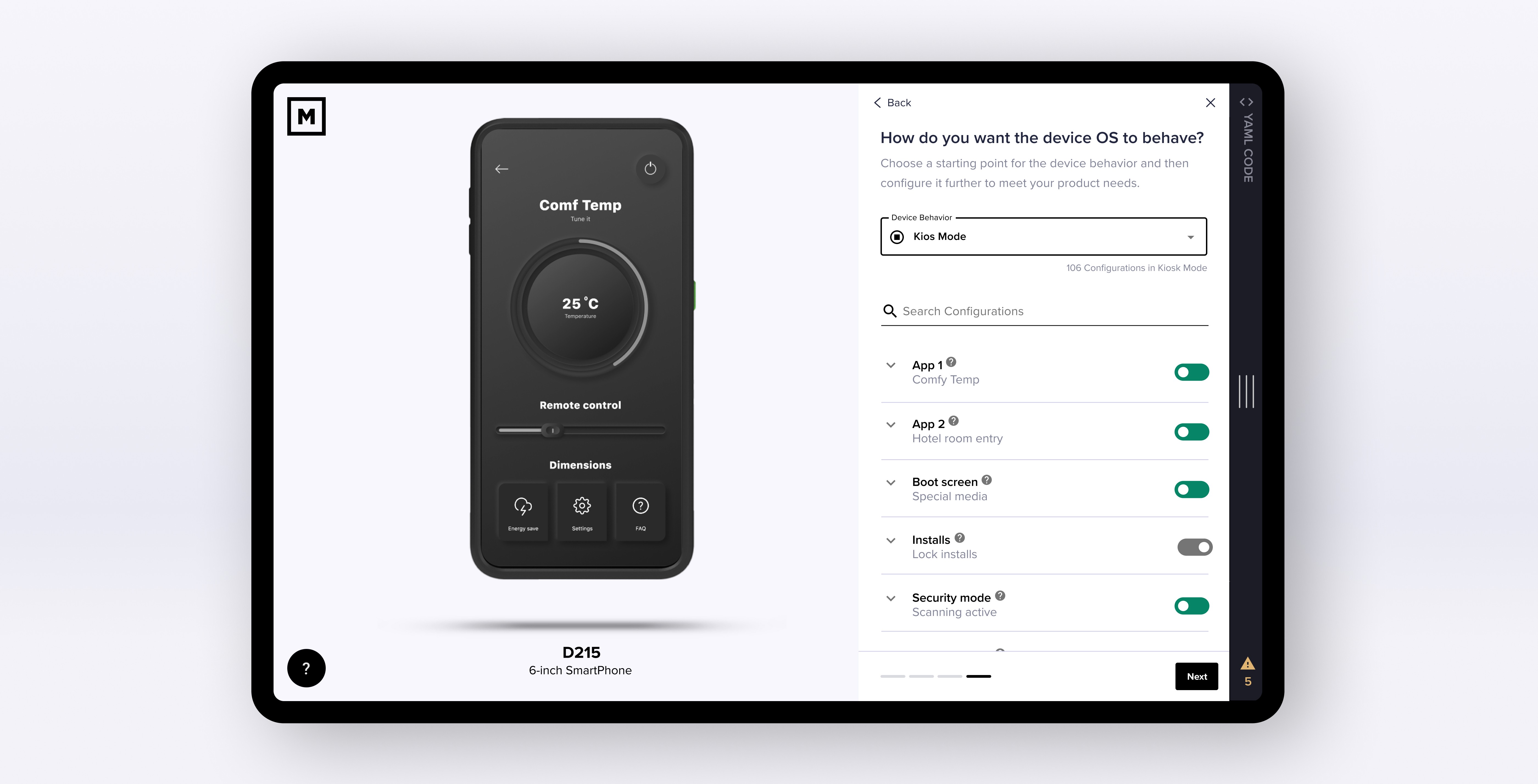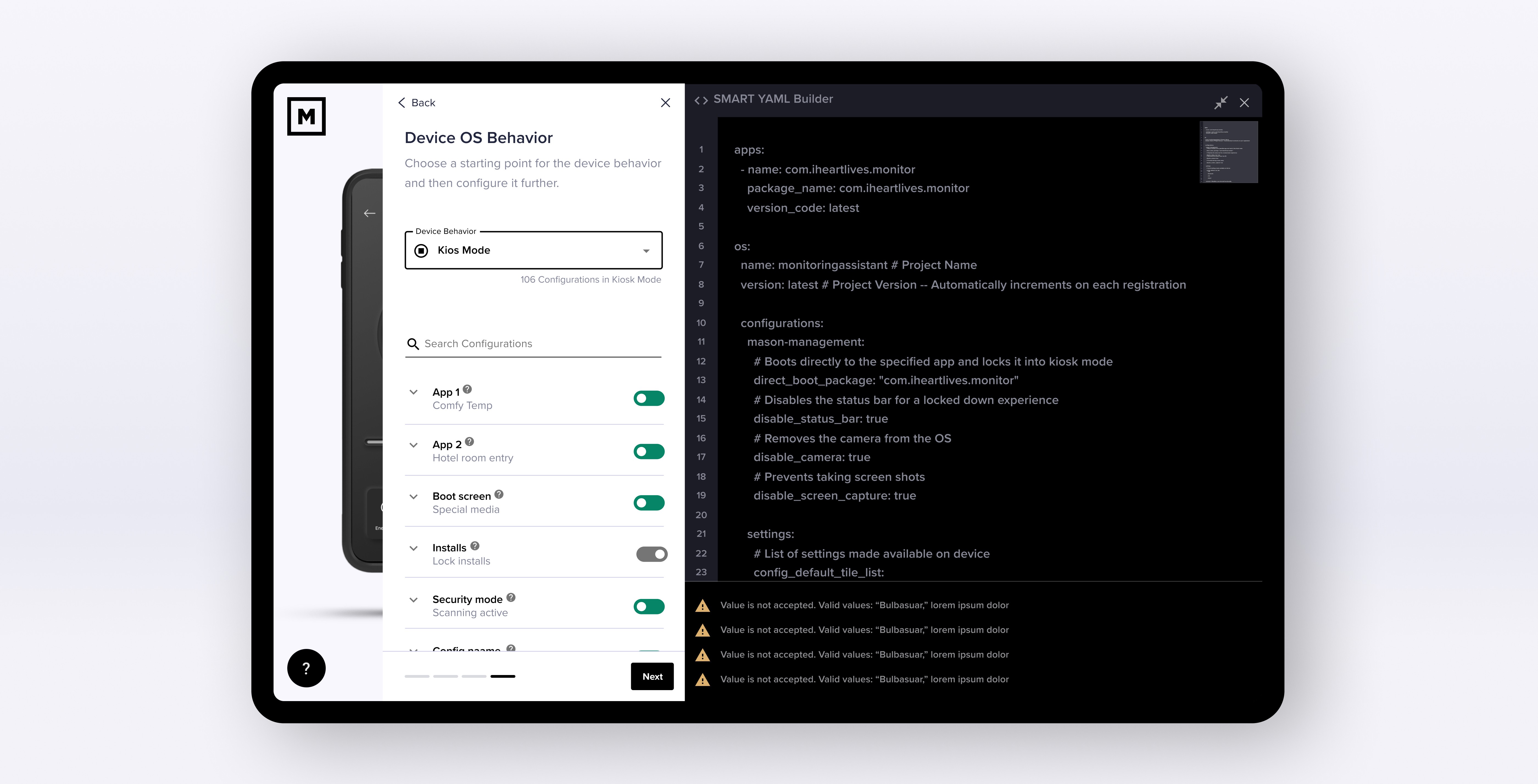 Templated OS configs give every user a starting point for building their unique smart product. A split-screen interface supports both technical and less-technical user workflows to build with Mason OS services through an emulated device, toggle/switch configs, and smart YAML type-ahead code builder.